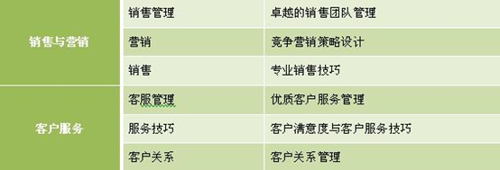 公司各個(gè)組織單元下的職能可以進(jìn)行進(jìn)一步的細(xì)分,根據(jù)細(xì)分的職能就可以確定專(zhuān)業(yè)方向上的培訓(xùn)課程體系。人力資源單元可以分為人力資源管理、招聘、員工發(fā)展、績(jī)效、薪酬、員工關(guān)系;行政單元可以分為行政管理、秘書(shū);財(cái)務(wù)單元可以分為財(cái)務(wù)管理、會(huì)計(jì)、審計(jì);物流與供應(yīng)單元可以分為采購(gòu)、物流、倉(cāng)儲(chǔ);生產(chǎn)與質(zhì)量管理單元可以分為生產(chǎn)管理、現(xiàn)場(chǎng)管理、流程管理、質(zhì)量管理、過(guò)程管理;銷(xiāo)售與營(yíng)銷(xiāo)單元可以分為銷(xiāo)售團(tuán)隊(duì)管理、營(yíng)銷(xiāo)、銷(xiāo)售、市場(chǎng);客戶服務(wù)單元可以分為客服管理系統(tǒng)、客戶服務(wù)、客戶關(guān)系。以下為專(zhuān)業(yè)類(lèi)課程體系部分部分內(nèi)容: