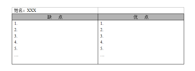 - 第四步,從今天開始,你開始“強(qiáng)迫”自己每一天或每一次見到他時(shí),必須從他身上找到一個(gè)或一個(gè)以上的優(yōu)點(diǎn),并記錄在左邊“優(yōu)點(diǎn)”欄中,這個(gè)過程要求持續(xù)21天或21次以上,直到習(xí)慣。下來,是游戲效力的關(guān)鍵步驟之一。不要試圖偷懶,僅憑腦袋記憶。如果公憑記憶行事,將太容易使你半途而廢了。